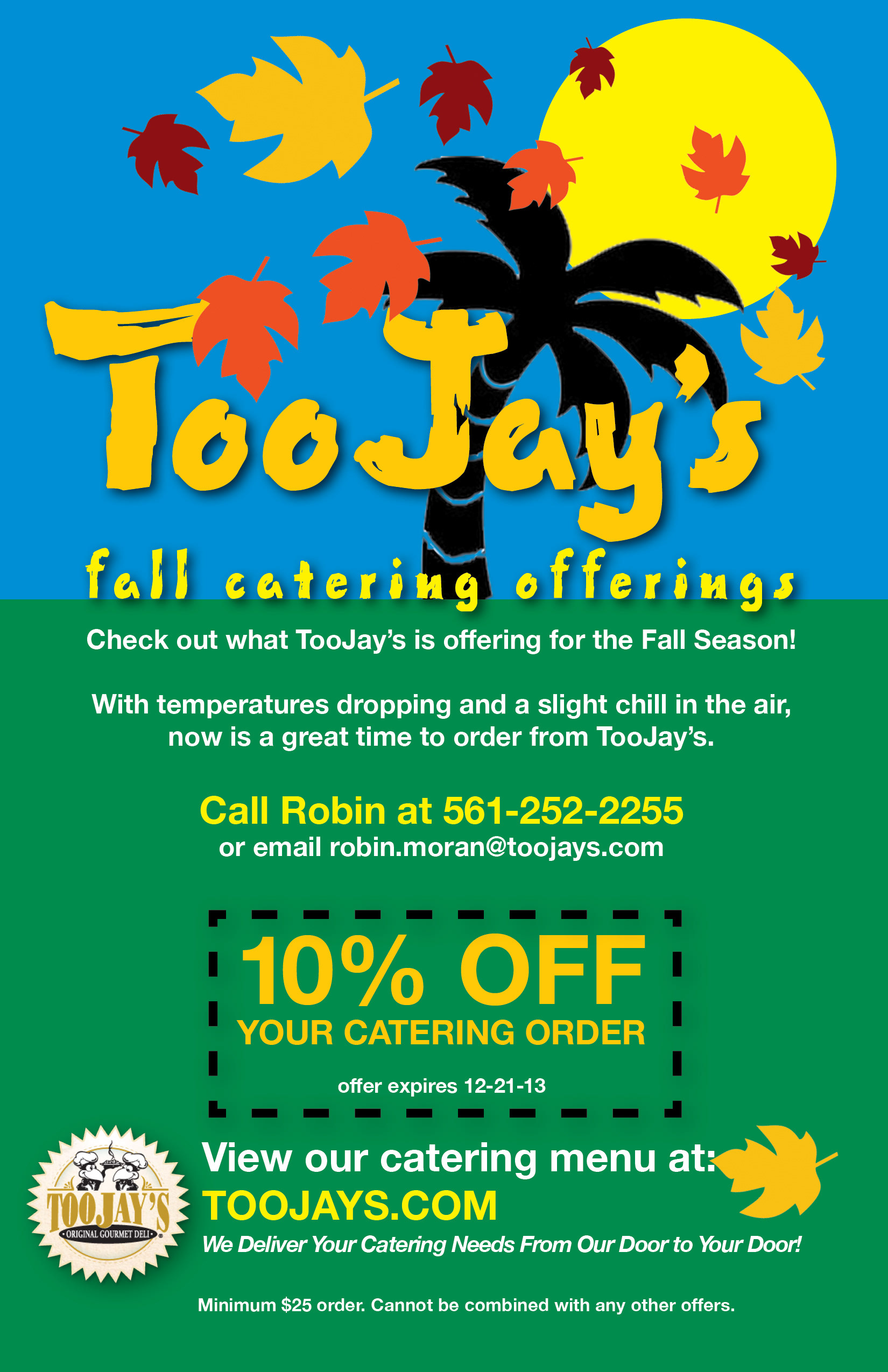 This is a hand-out flyer for a sales rep from TooJay's, a restaurant/catering company in Palm Beach, Florida.